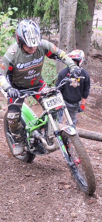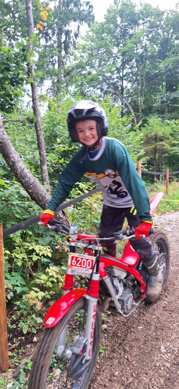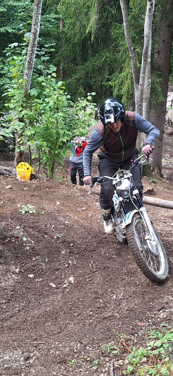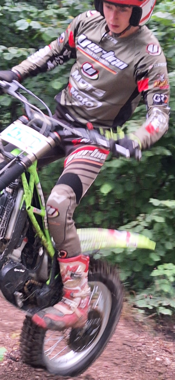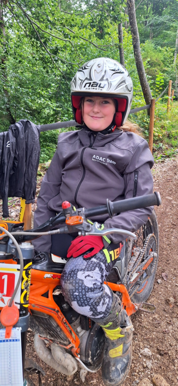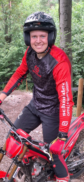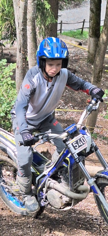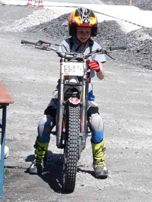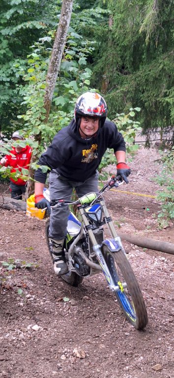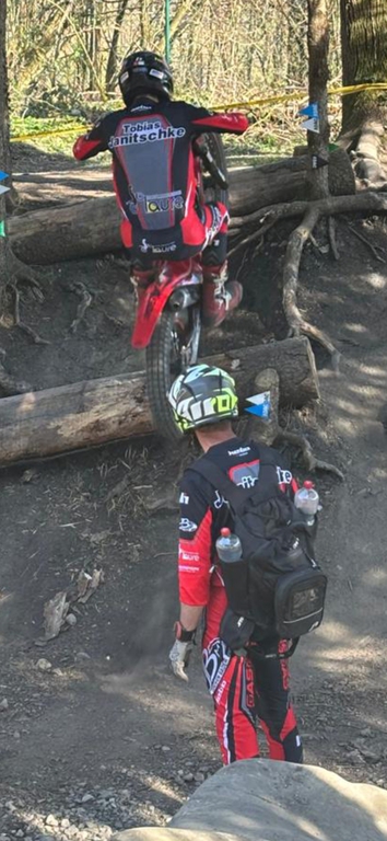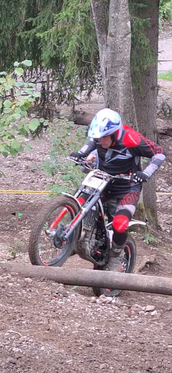 Tobias Janitschke vom AC Garmisch-Partenkirchen e.V. ging in der zweithöchsten Spur an den Start und hat sich viel vorgenommen. Da Tobias erst 15 Jahre alt ist, muss er den Wettbewerb noch mit der 125er bestreiten. Sein Minder, der ihn beim Rennen unterstütz und hilft, ist Jonathan Heidl, "Joni". Die Startzeiten wurden ausgelost und nach Klassen ging es dann an den Start. Tobias hat gleich die ersten Sektionen mit 1-0-0-1 befahren, in der fünften Sektion dann 5-Fehler-Punkte aber in Sektion sechs und sieben wieder jeweils 0 Fehler. So konnte er von 12 Sektionen auf seinem Punktekonto 24 vermerken. Allerdings ist er in der drittletzten Sektion gestürzt, und hat sich an der Hand und Oberschenkel verletzt. Außerdem musste in der Pause das Motorrad repariert werden, womit er dann mit 30 Minuten Verspätung in die 2. Runde startete. Er hat alles auf eine Karte gesetzt und hat Speed gegeben – er konnte die zweite Runde rechtzeitig im vorgegebenen Zeitfenster beenden (ohne Strafpunkte zu kassieren) und hatte hier dann 29 Fehlerpunkte. Am Samstag beendete er das Rennen mit 53 Fehlern gesamt und konnte einen sehr guten 6. Platz erreichen.